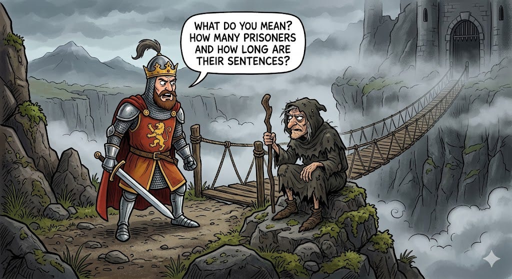 You’ll likely have seen this puzzle in a puzzle book with the solution above. In this case, however, you can work out a better solution in advance that challenges the assumptions of the interviewer. Then you can channel King Arthur with something like: “What do you mean? How many prisoners are there and how long are their sentences?” Then you can explain as below.