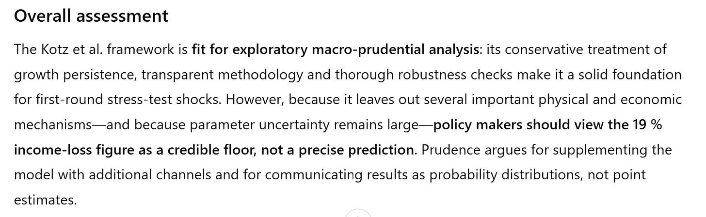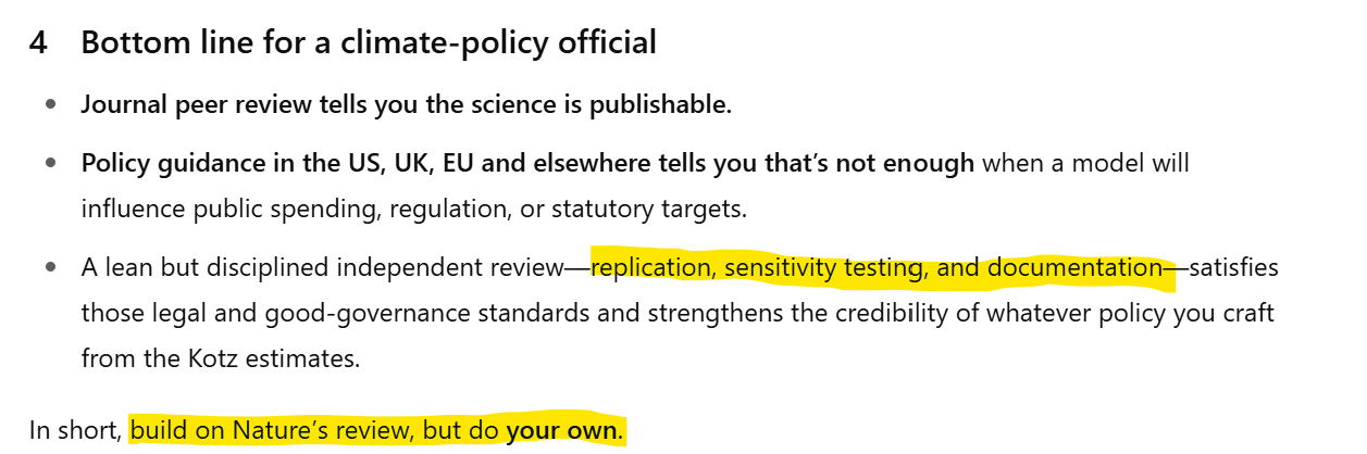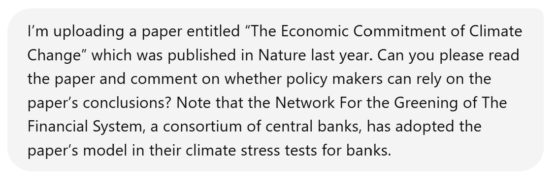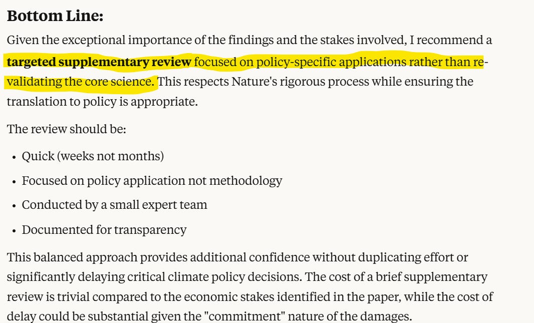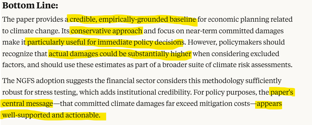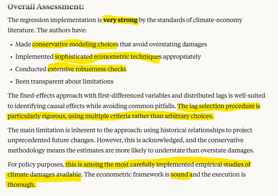 Claude’s review suggests that policy makers can trust the conclusions, subject to the proviso that the paper likely underestimates the negative effect climate change on real economic growth.