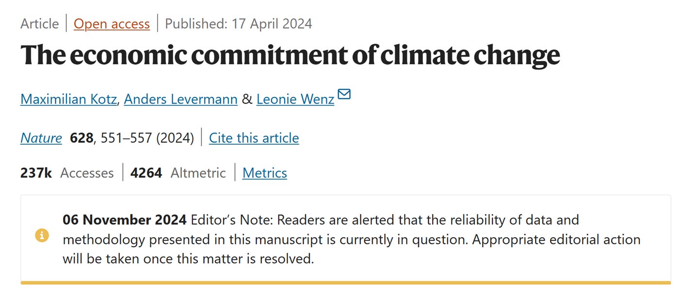 Upon reading the paper, I saw three potential red flags. To explore them, I downloaded the paper’s R (a statistical modeling language) and python (a genreal purpose computer language) replication code and re-estimated the paper’s regression model and I also re-simulated their climate economics model under alternative assumptions. I found three major problems that seriously call into question the paper’s results.