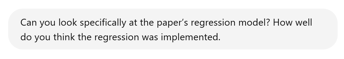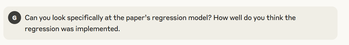 Claude has performed its review and pronounced the paper sound. A policy maker or a journalist might stop right here. However, let’s assume that the questioner saw that the paper has a regression model, which is a statistical model relating climate change to loss of real economic growth. Perhaps these more cautious questioners might ask Claude to review the regression model.