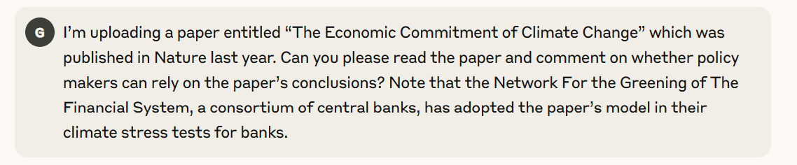 What is a real world scenario? In economics, an academically-oriented economist should be able to review a highly technical economics research paper that has major policy implications. Peer review is only a subset of what a human economist might do, but it allows us to define a clear test. We’ll ask Claude to review the academic paper "The Economic Commitment of Climate Change" that appeared last year in the peer-reviewed academic journal Nature. This is a hard test, since most human PhD economists could not review the paper. Economics, like other academic disciplines, is highly specialized. To review this paper, you would need some familiarity with the recent academic research on the effect of climate change on economic growth. But if we are on the precipice of AGI, Claude should be able to do it.