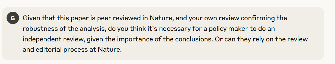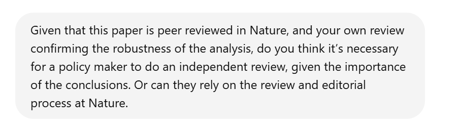 ChatGPT reiterated that we should do an independent review of the Nature article before using it for policy, in contrast to Claude.