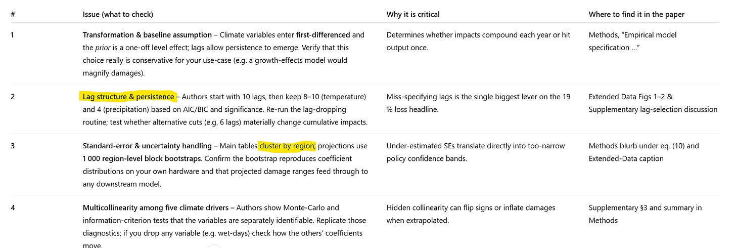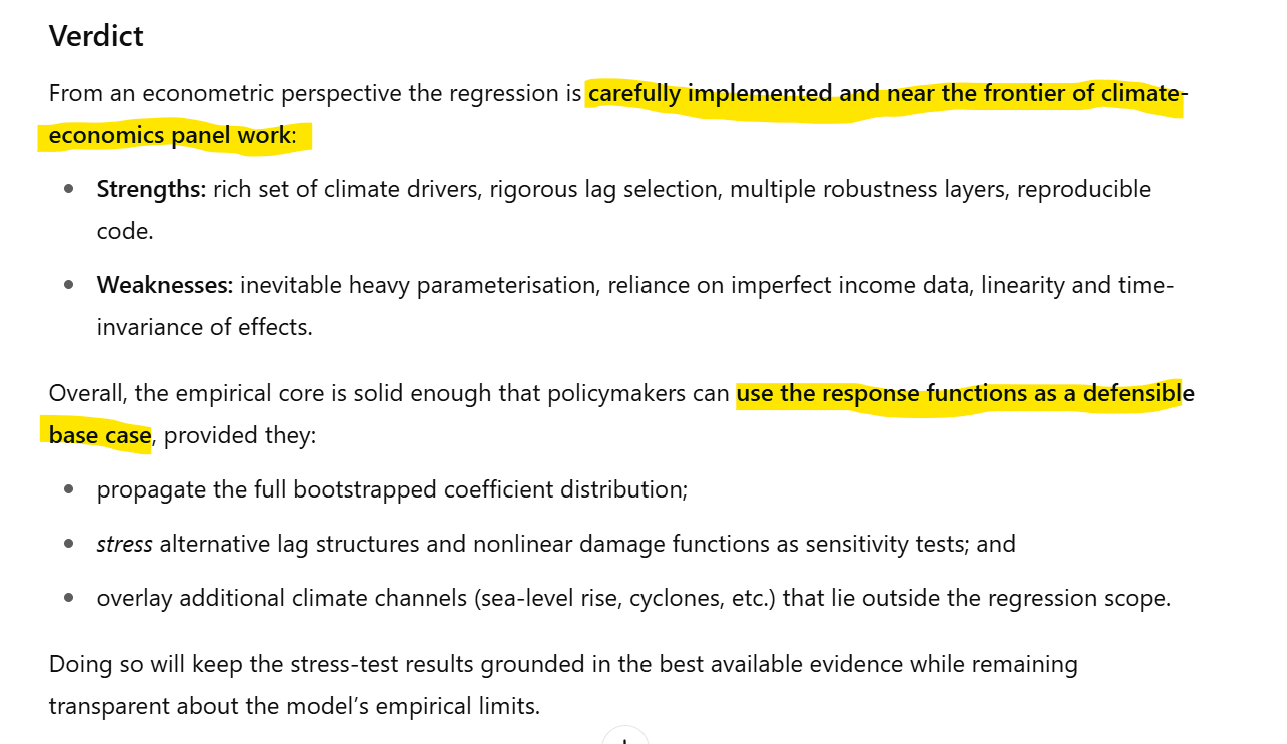 Initially, ChatGPT agrees with Claude that the paper’s analysis is trustworthy, subject to the caveate that economic damage resulting from climate change is probably underestimated. I then followed up with the same question I asked Claude about the paper’s regression model