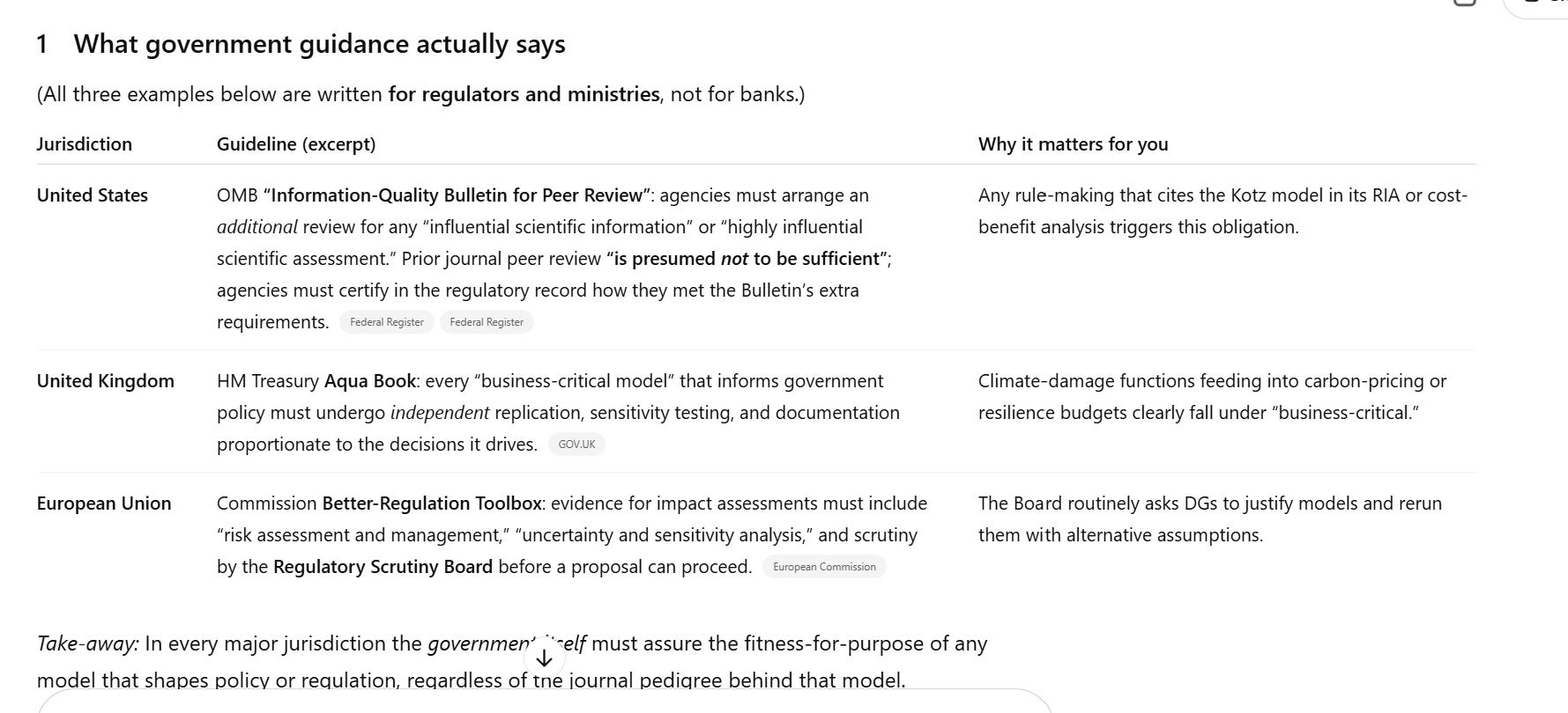 Interestingly, ChatGPT did a web search before it answered my question, finding a number of documents that said that banks need to independently validate models before using them. ChatGPT then concluded that policymakers should also independently validate the Nature paper. But I pointed out the documents ChatGPT cited referred to banks, not governments. ChatGPT did a further web search and found the following documents.