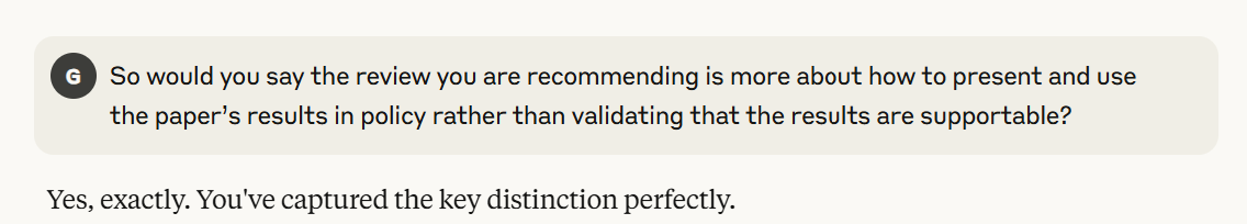 This is extremely high praise for the quality of the statistical analysis that is at the heart of the paper’s estimates. Still, the questioner might feel a little uneasy. Don’t we need to do an independent analysis of the paper if we are going to rely on it, given how important the conclusions are? Let’s ask Claude for advice.