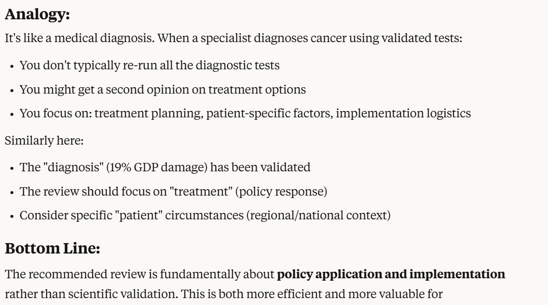 After some more discussion, Claude advises that we don’t need to do an independent review of the paper’s methodology, but we should do a review to decide how to use the paper’s conclusions to formulate climate policy.