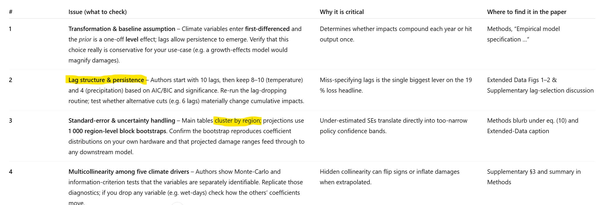 In the table above, I have reproduced the first four of the nine issues that ChatGPT raised. In general, ChatGPT doesn’t zero in on any major problem other than the lag structure issue, highlighted, which is critically important. However, it’s not clear that ChatGPT is suggesting a procedure that would uncover the problem. ChatGPT also misses the importance of the paper’s assumption of standard errors clustered by region, which I found led to most parameters being statistically insignificant when you reasonably modify that assumption.